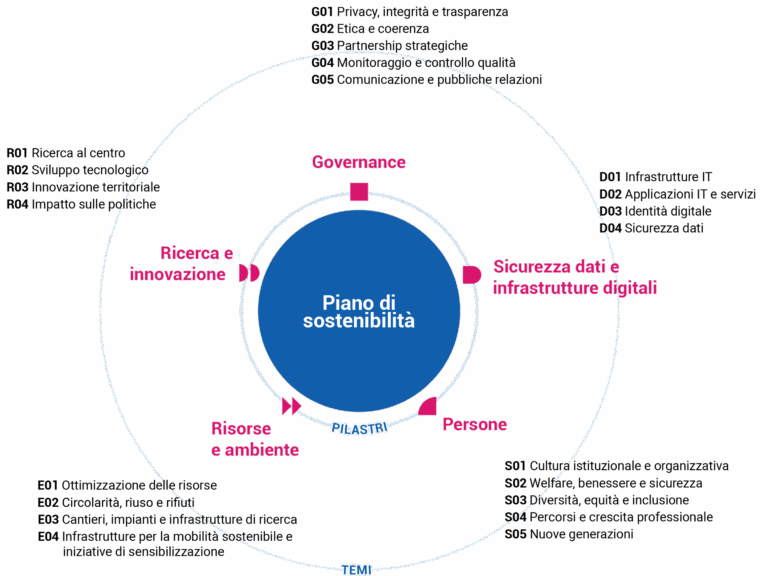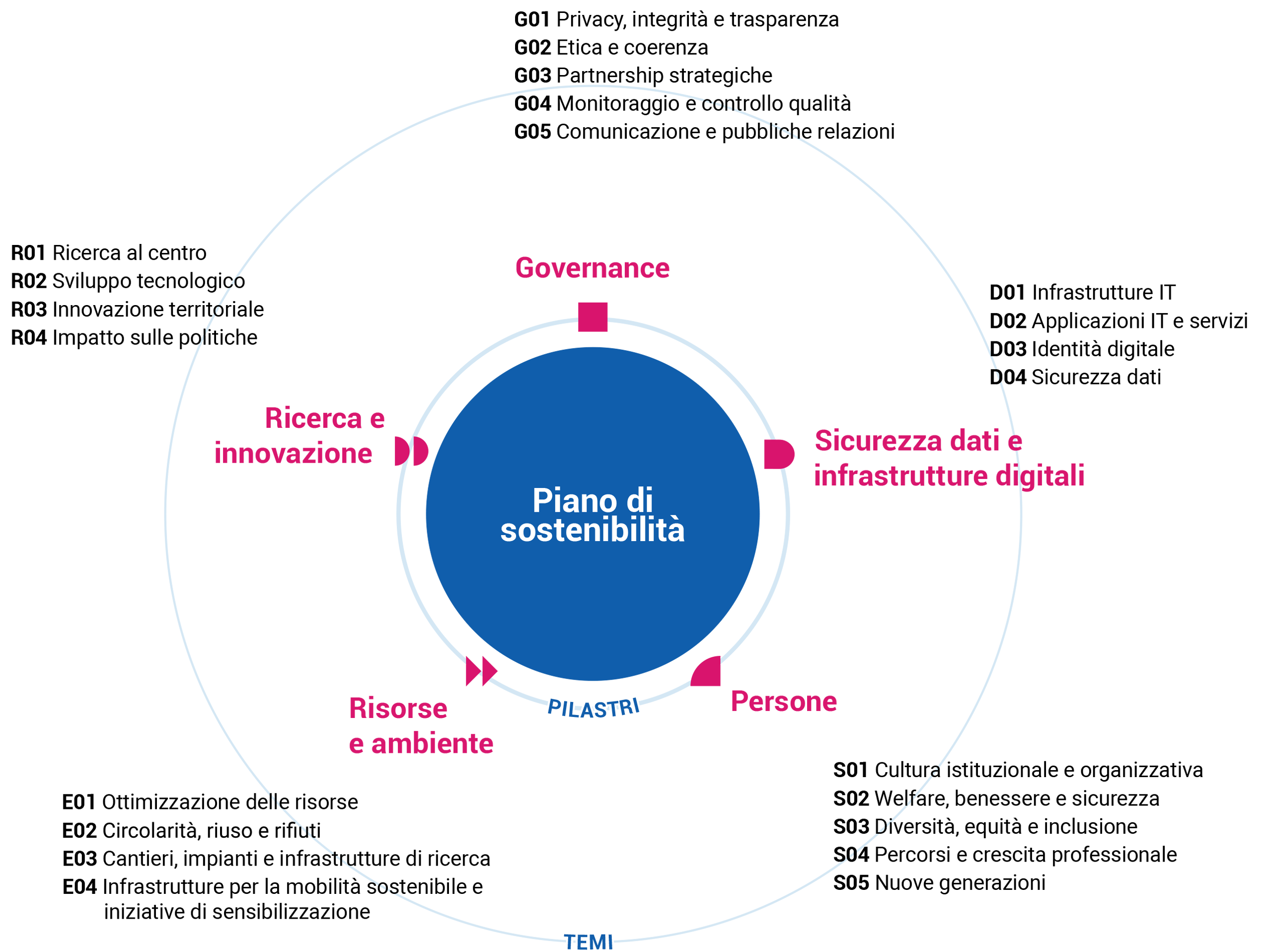 La struttura del Piano si sviluppa attorno a 5 pilastri cardine per il rispetto degli elementi ESG – environmental (E), social (S) e governance (G) – ma estende la sua applicazione verso due ulteriori elementi portanti per FBK e abilitatori di una sostenibilità a 360°: la ricerca e l’innovazione (R) e la sicurezza dei dati e delle infrastrutture digitali (D). Ognuno di questi pilastri si declina poi in 4 o 5 Temi, illustrati di seguito.