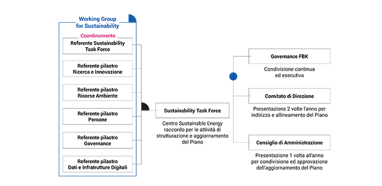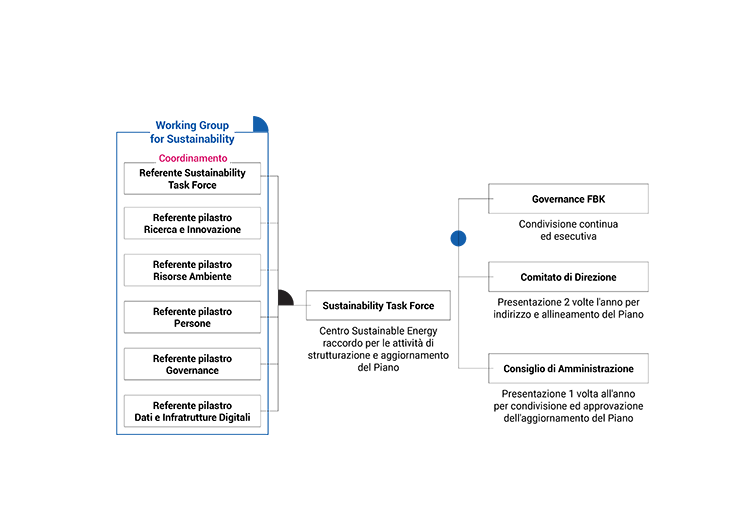 Nell’elaborazione di questo Piano, è emersa la necessità di sviluppare politiche di sostenibilità lungimiranti, efficaci e coese all’interno della Fondazione, che permettano di identificare le priorità e orientare le risorse su temi strategici per la sostenibilità. Per consentirlo, è stata identificata una “governance di sostenibilità”, ovvero un gruppo di confronto interno a FBK, che guidi la definizione di un programma complessivo e sinergico in grado di assicurare la coerenza e consistenza delle azioni da mettere in campo.